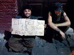 3. Objects/People: For this section of pictures, I will use my friends as homeless people and may even use actual homeless people. I will have my friends make their own funny signs to hold up.